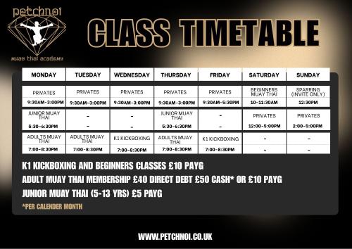 Adult Muay Thai Monday, Tuesday & Thursday £10 per class, £40 per calendar month Direct Debit or £50 per calendar month cash.